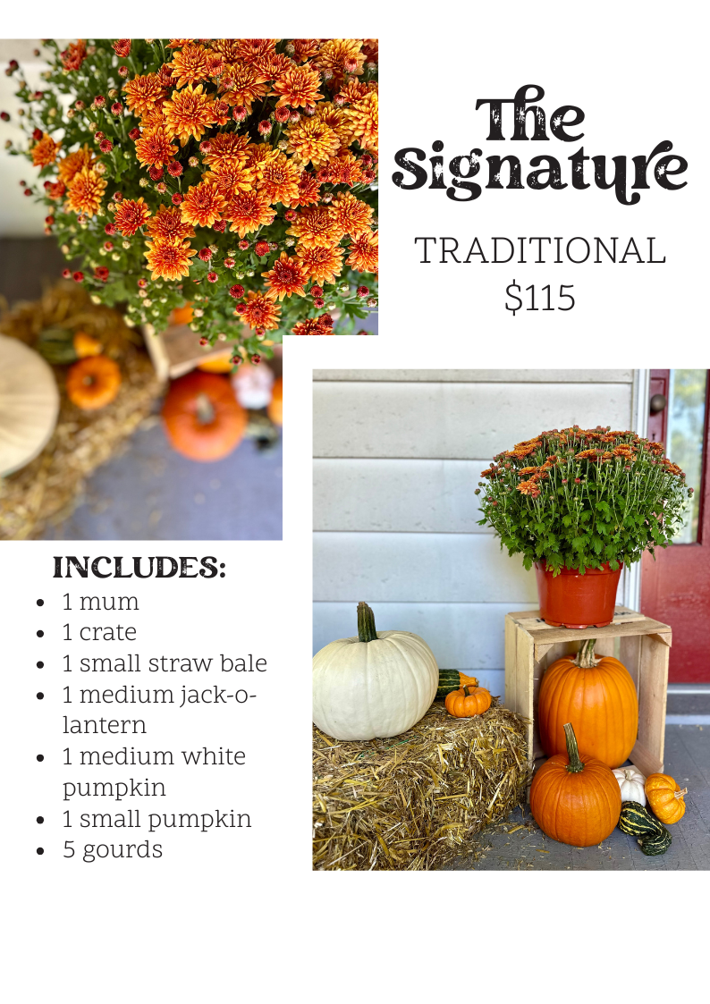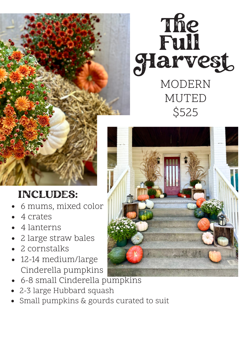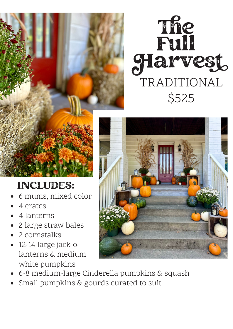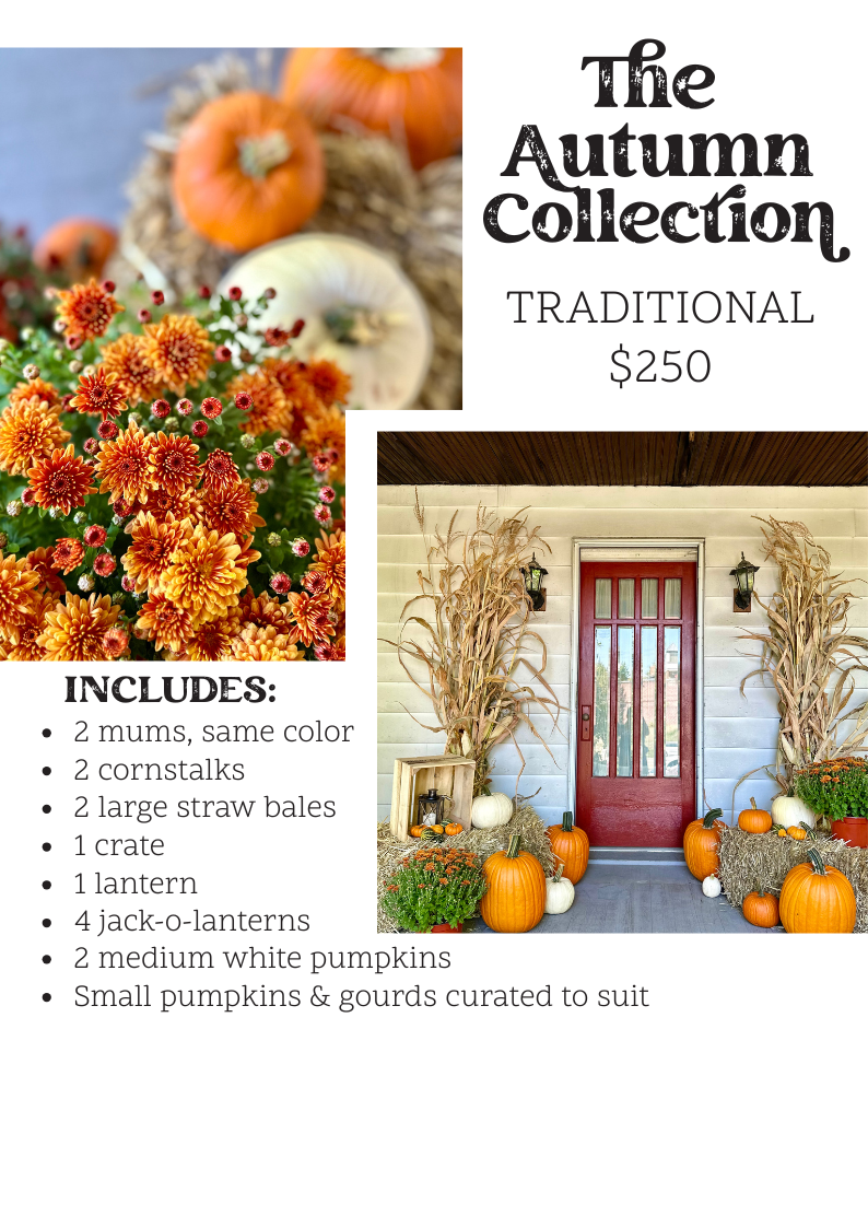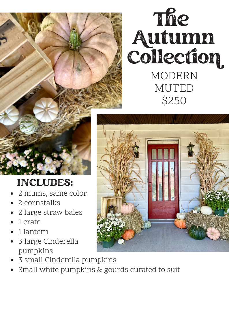 Life gets busy — that’s where we come in. Simply choose from our thoughtfully designed packages, and we’ll handle the rest! From pumpkins and mums to straw bales, crates, and more, each arrangement is hand-selected to perfectly blend colors, textures, and styles that reflect the cozy charm of autumn.